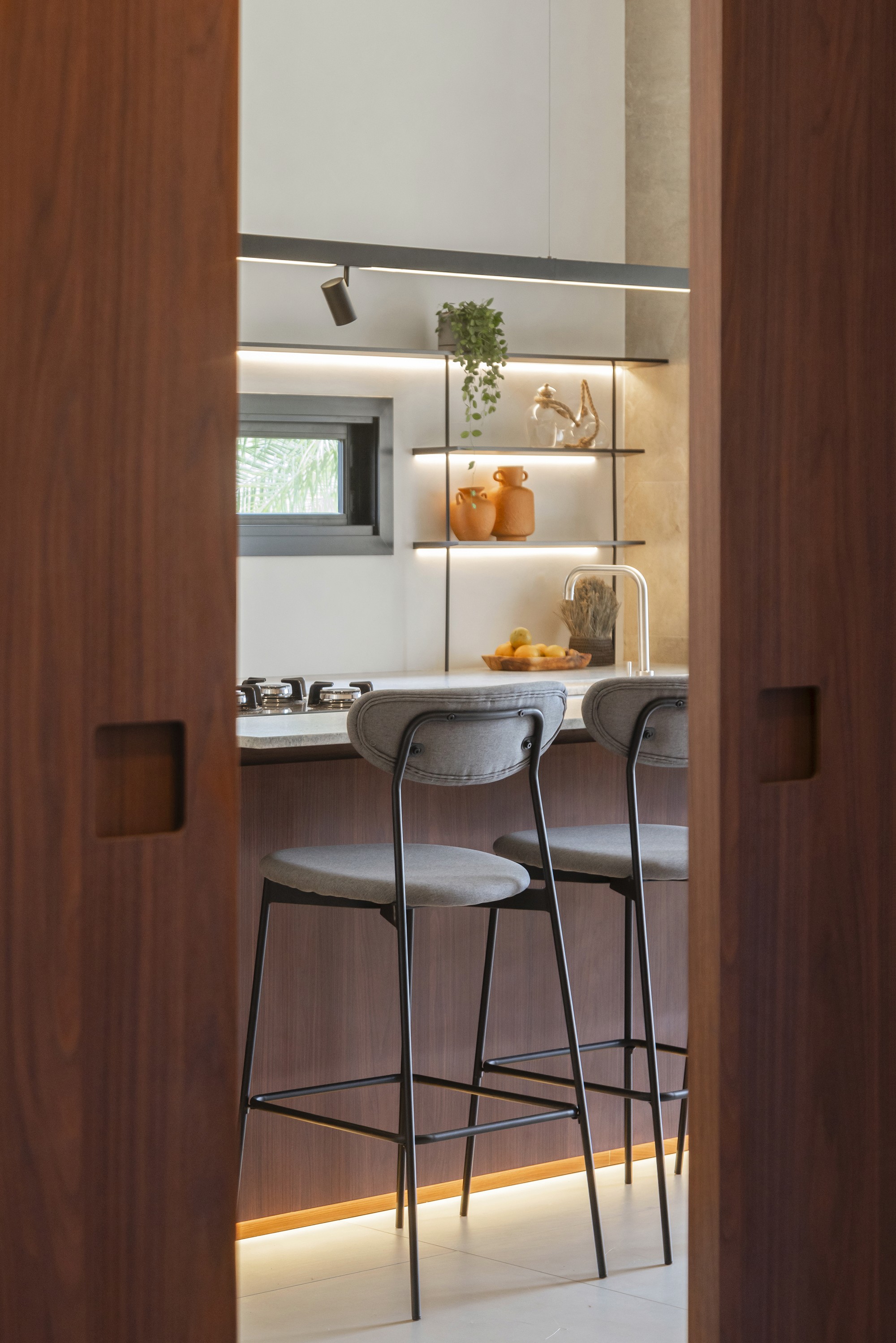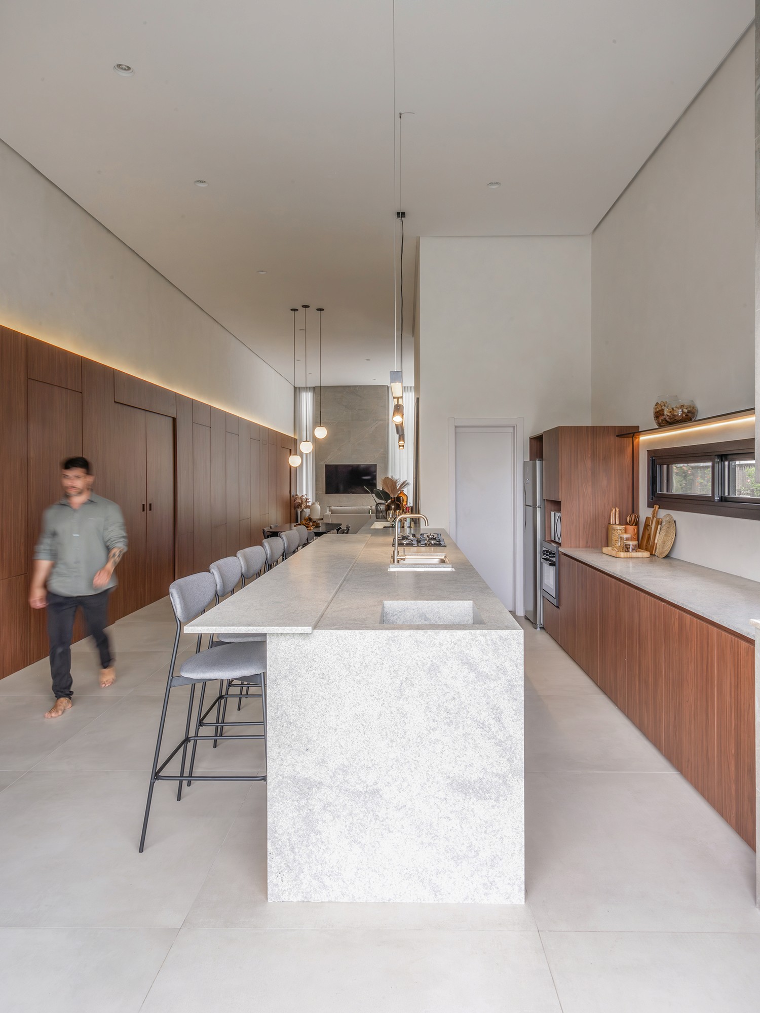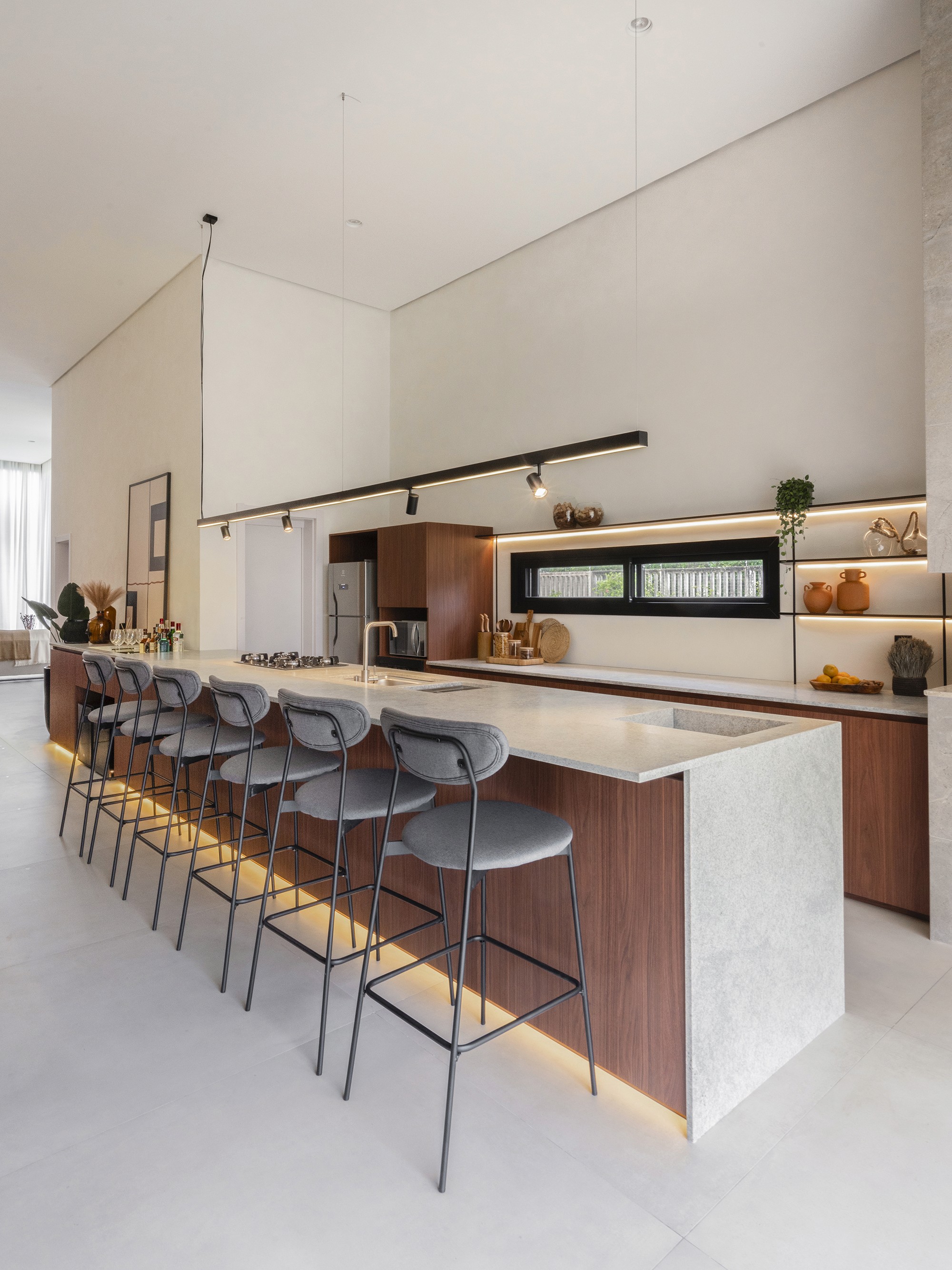Um espaço onde a sutileza do design se transforma em experiência. Através da textura quente da madeira e ao toque refinado do granito escovado, a linearidade do espaço se contrasta em equilíbrio ao integrar todo o living. A iluminação indireta estratégica, não apenas ilumina, mas revela volumes, destaca formas e cria uma atmosfera envolvente e aconchegante, propondo ao usuário um convívio mais significativo.