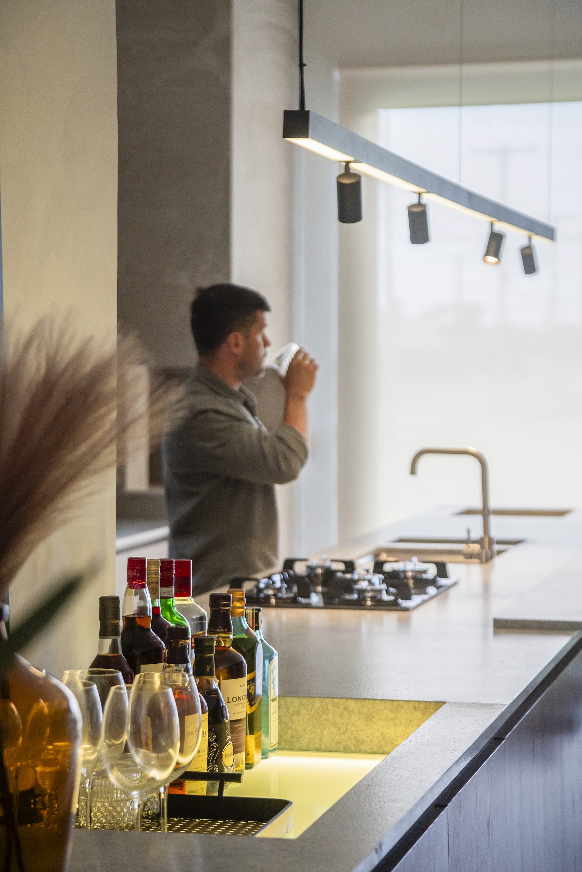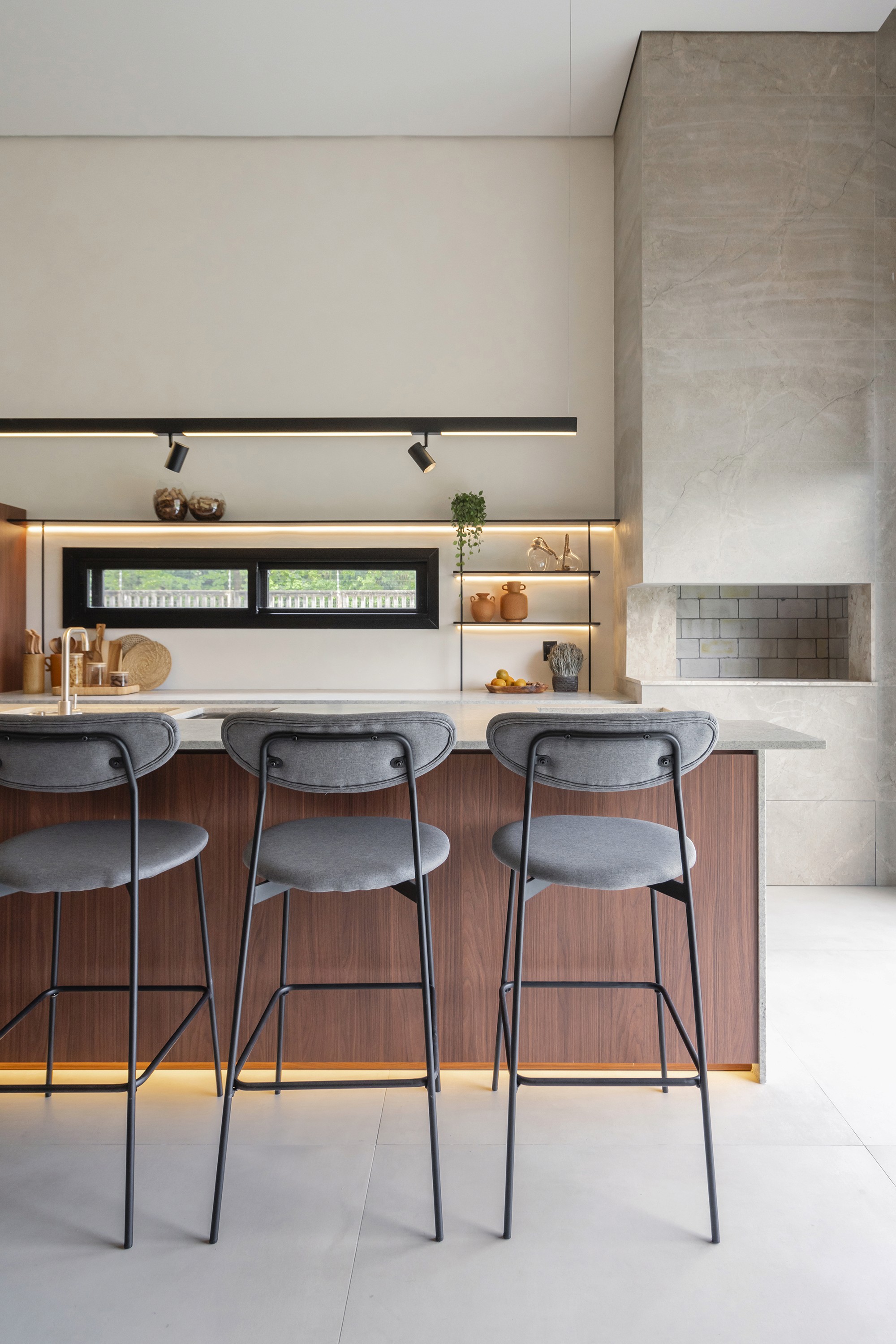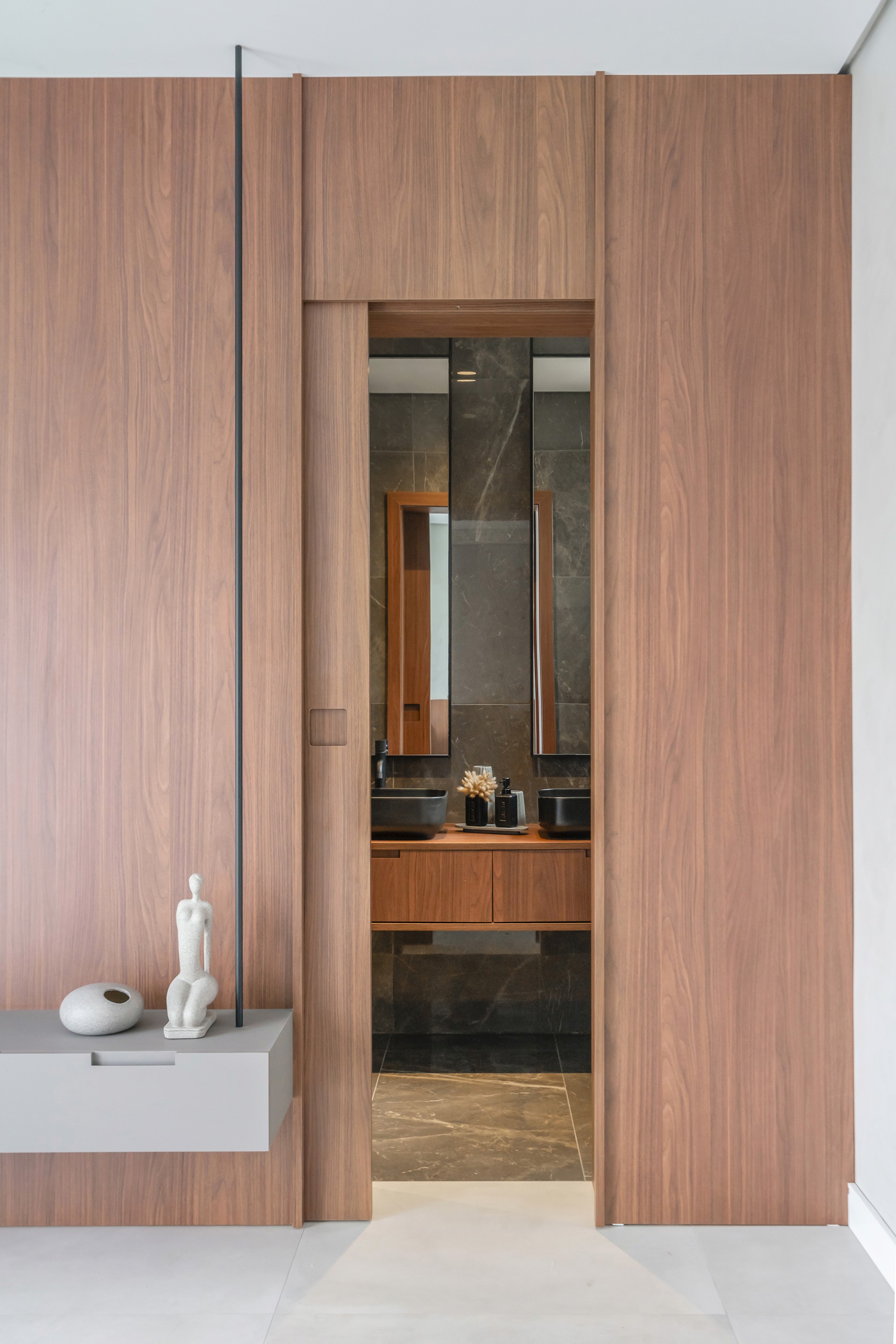 Um espaço onde a sutileza do design se transforma em experiência. Através da textura quente da madeira e ao toque refinado do granito escovado, a linearidade do espaço se contrasta em equilíbrio ao integrar todo o living. A iluminação indireta estratégica, não apenas ilumina, mas revela volumes, destaca formas e cria uma atmosfera envolvente e aconchegante, propondo ao usuário um convívio mais significativo.